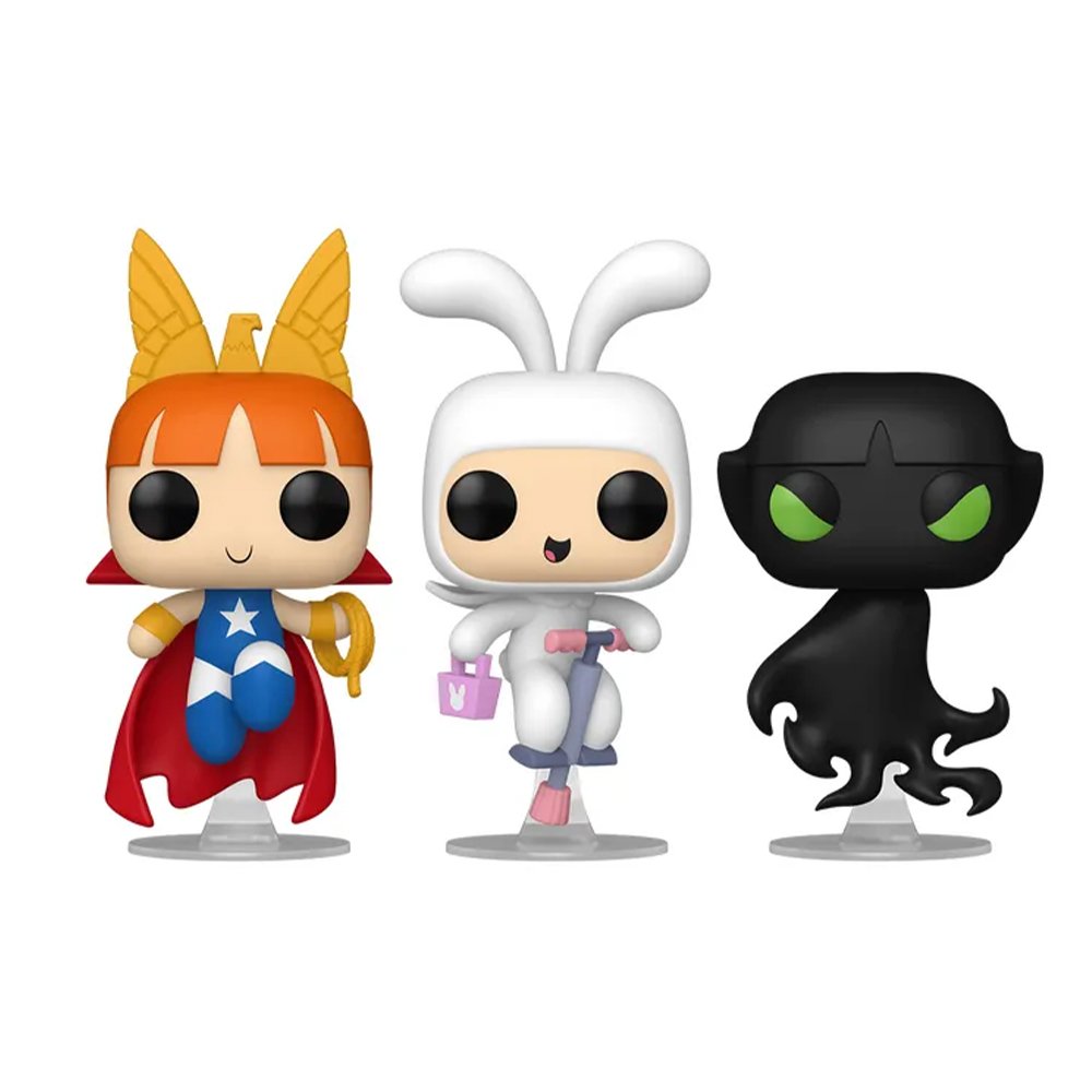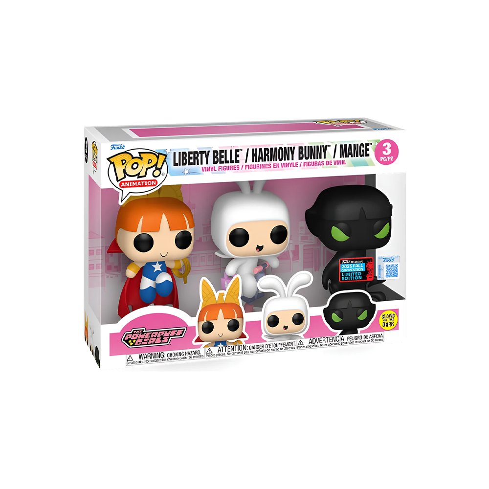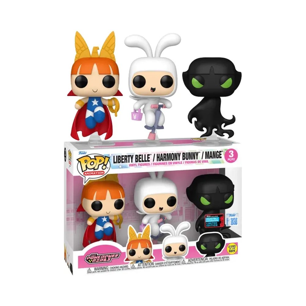 Set coleccionable Funko Pop! Animation que incluye a Liberty Belle, Harmony Bunny y Mange, inspirado en The Powerpuff Girls. Este paquete de 3 figuras es una edición especial y limitada, ideal para coleccionistas.