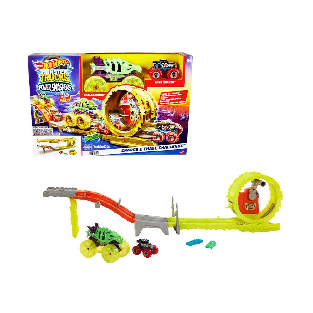 ¡Acción extrema y choques espectaculares con Hot Wheels Monster Trucks! El set Power Smashers Charge & Chase Challenge está diseñado para vivir carreras llenas de velocidad, persecuciones y destrucción al estilo Monster Truck.